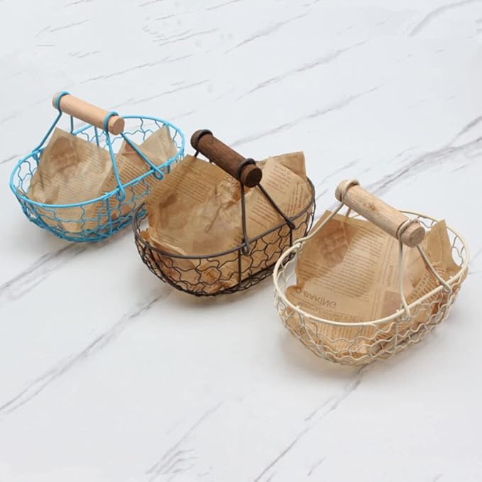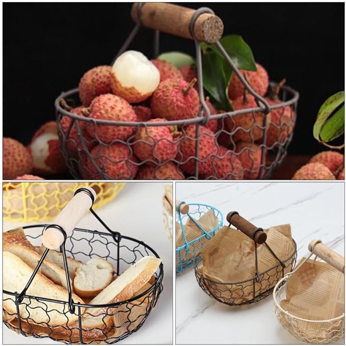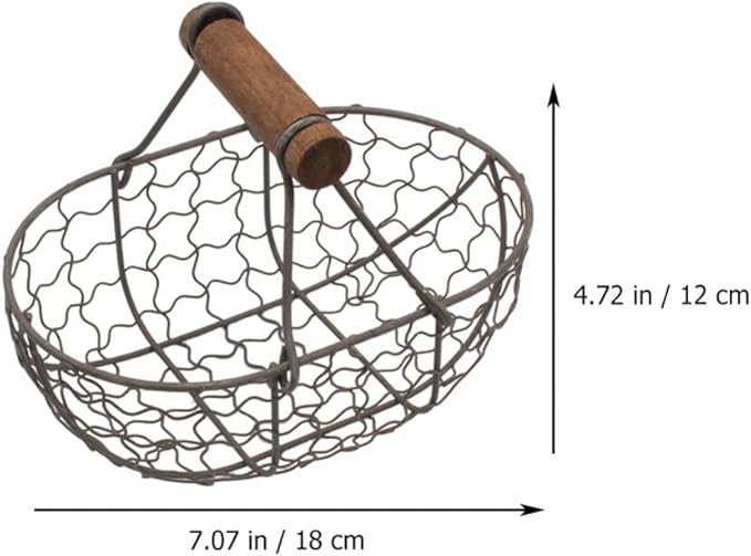 Drátěný košík na vajíčka s dřevěnou rukojetí, vintage oválný košík, dutý drátěný košík, úložný prostor pro cukrovinky pro kutily, bytové dekorace